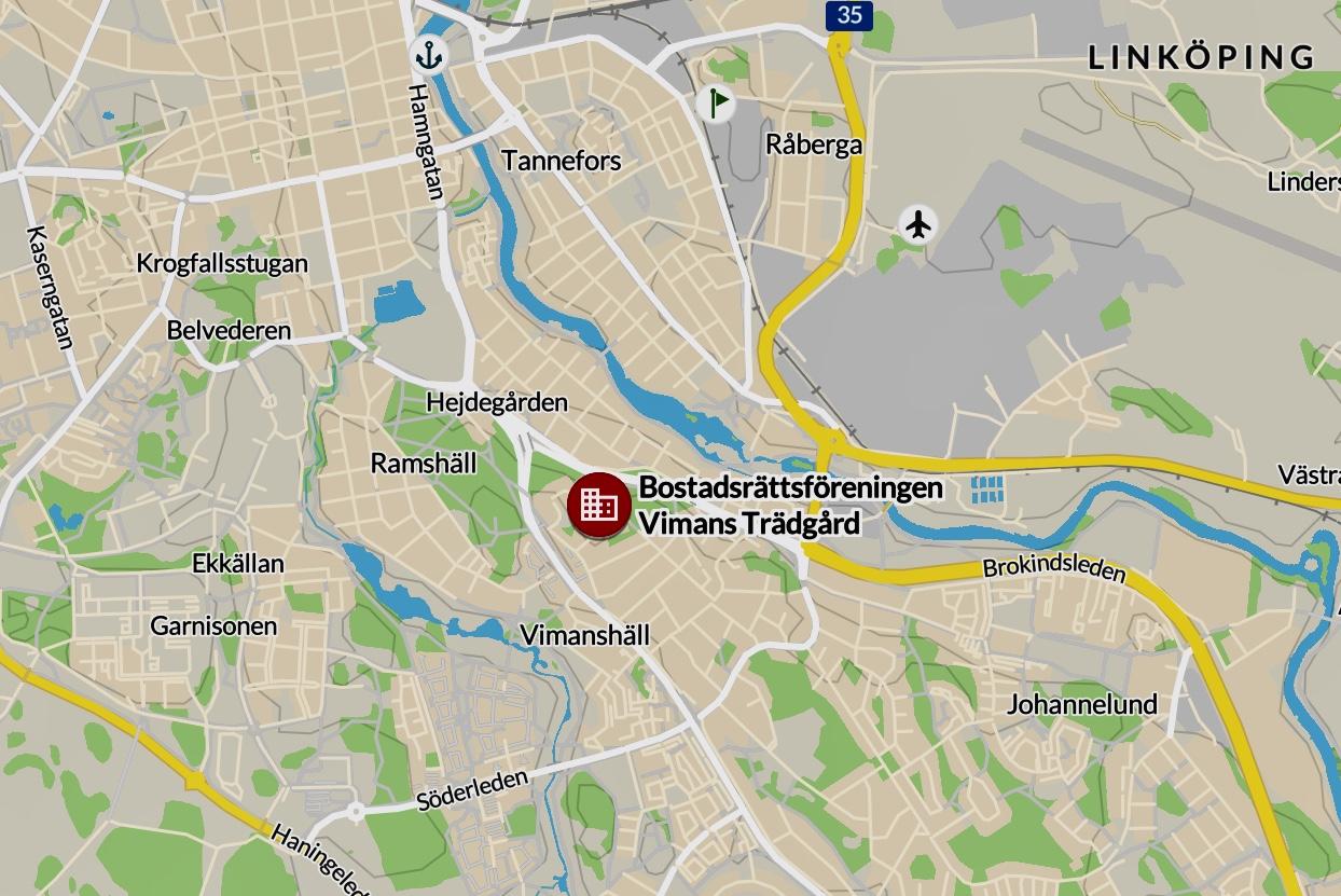 Vår bostadsrättsförening ligger i Vimanshäll, en av Linköpings högst belägna stadsdelar. Föreningens fastigheter ligger vackert i området med utsikt över stora delar av Linköpings stad.